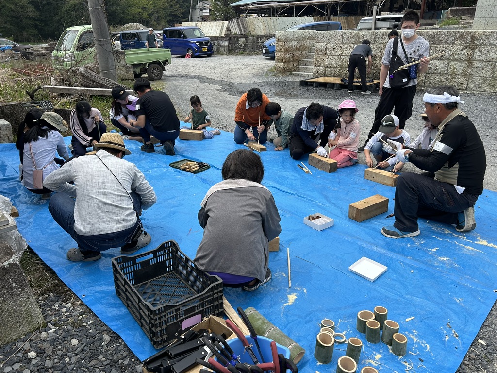 お腹がいっぱいになったら、子供も大人も、竹を使って自由工作! 竹のドラムや竹ぽっくり、水鉄砲、竹の弓矢、竹とんぼなど、見本も用意しておくので大丈夫。