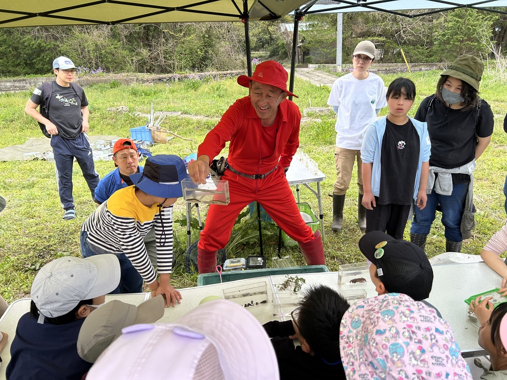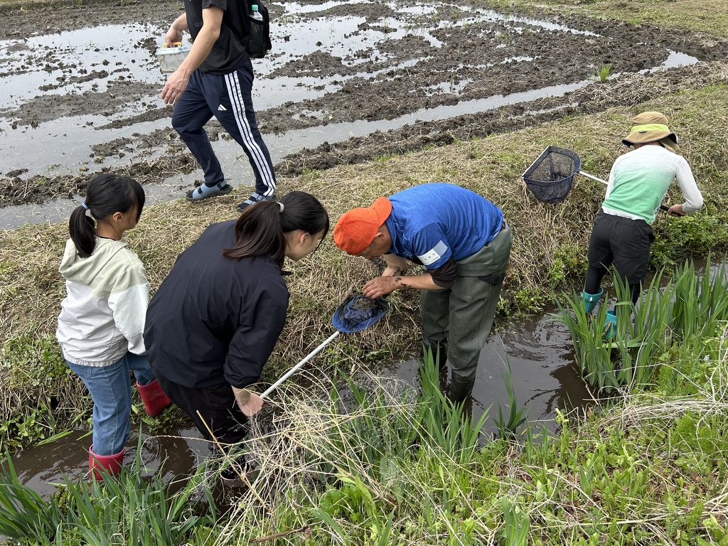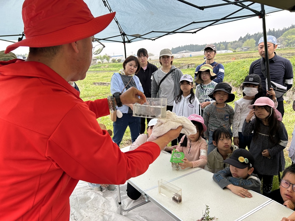 各自、網で水路をさらってみて!ザリガニやどじょう、しじみなどがいるかな?⾝近な⽔の⽣き物を⾃分の⽬で調べてみよう。体調が身近にいる生き物について教えてくれます。