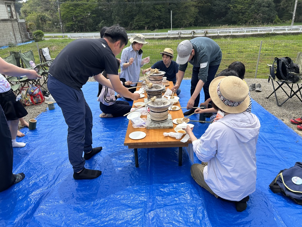 OYA体験工房へ戻ったら、羽釜で炊いたご飯をボールで潰して「ごへいもち」作りにチャレンジ!家族ごとに七輪で焼いてみよう!みそダレの香ばしい香りがたまりませんね!