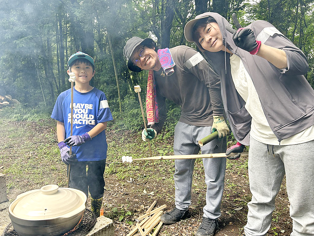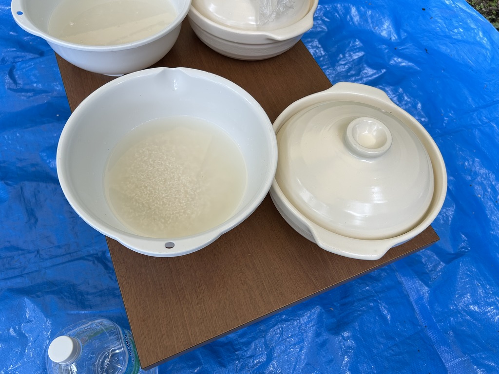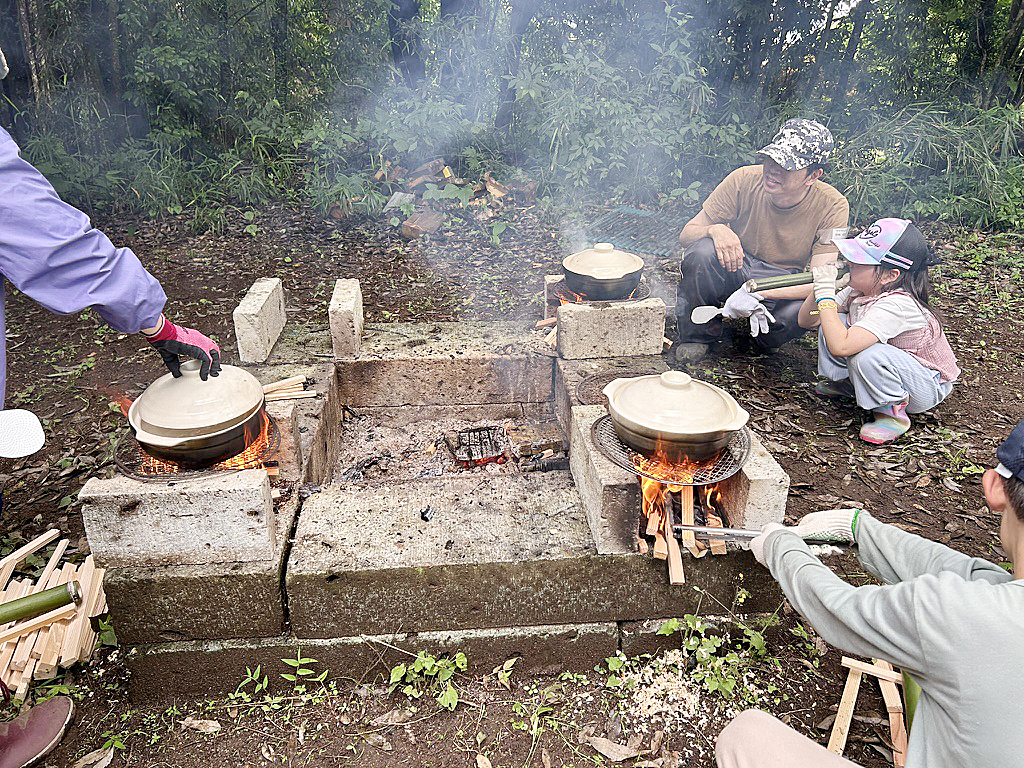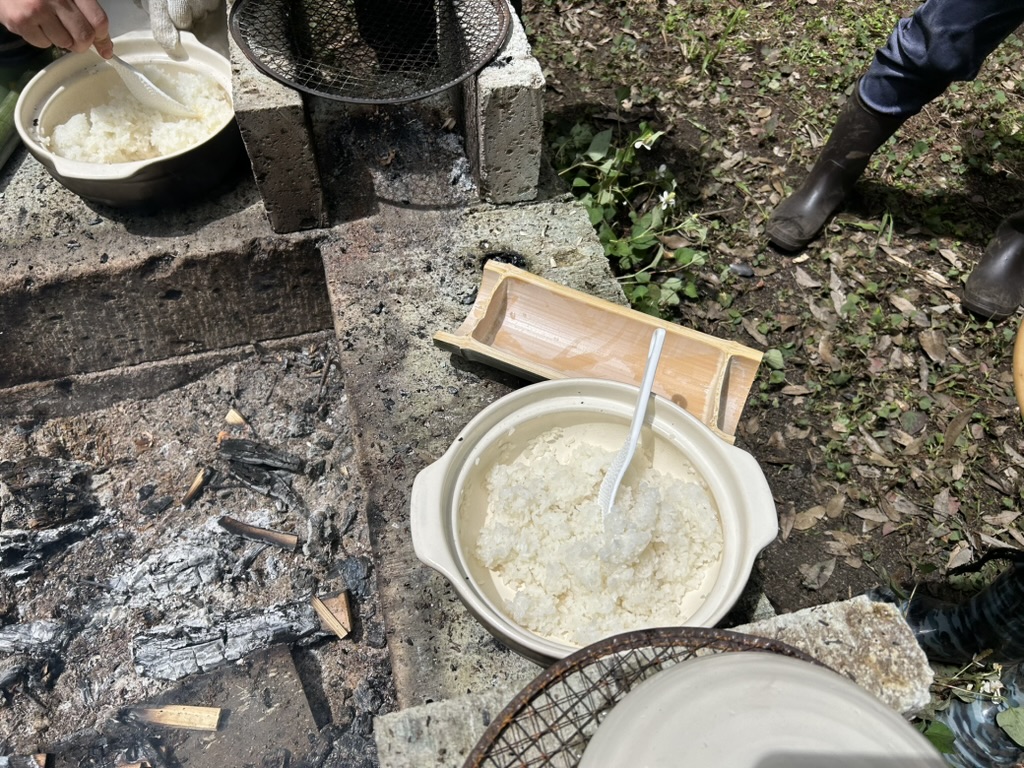 広場では土鍋で家族単位でご飯炊きに挑戦!上手に炊けなくても大丈夫、本部で羽釜ご飯も炊いているよ!