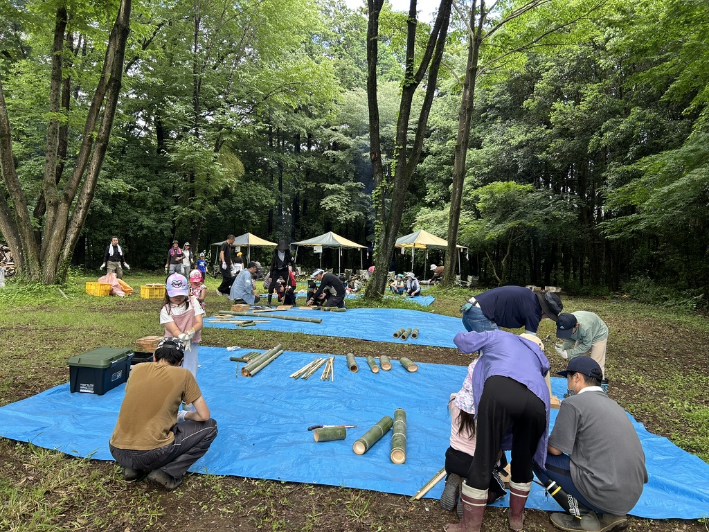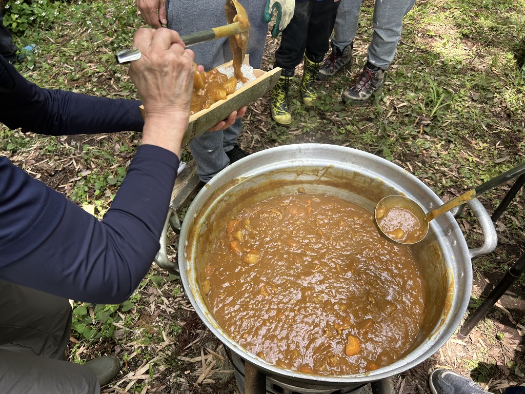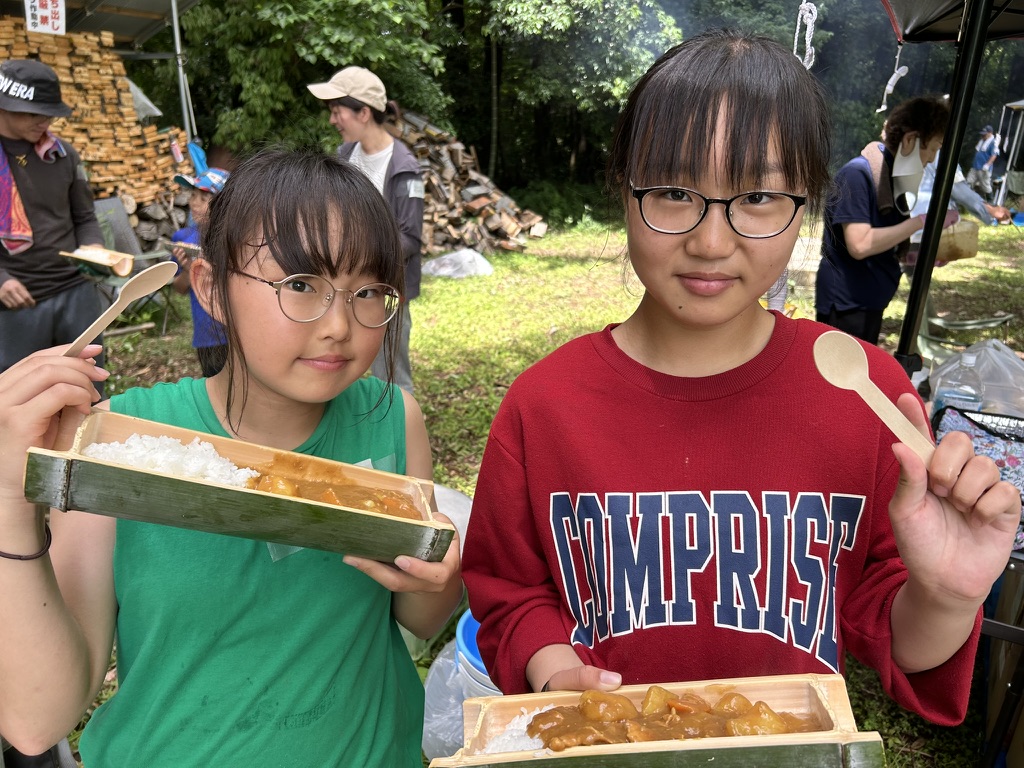 ご飯が炊けるまでに竹でご飯の器と箸を作ってね。ご飯が炊けたらカレーをたっぷりかけてもらって!鍋のおこげも、最高ですよ!