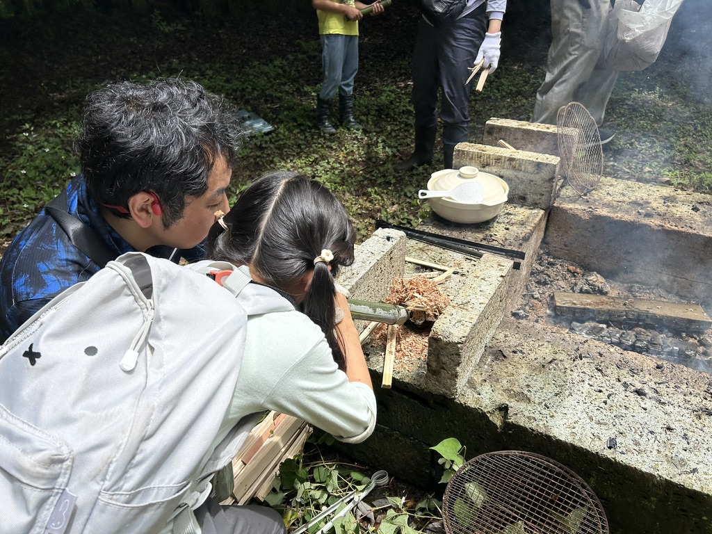いよいよご飯炊きスタート!火ふき棒で火の勢いをつけて!